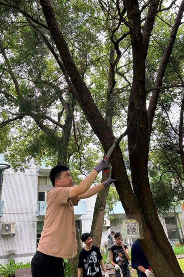 活動當天,同學們分工合作,有人修剪枝葉、有人清理殘枝落葉,伴隨著切割工具的節奏,庭園逐漸煥發生機。詹鳳春老師提醒學生,要先了解樹木的生理特性,才能為它們設計合適的措施,因為每一張設計圖都影響著環境的未來。中原地景系學生透過植栽整頓活動,從修剪樹木美學、規劃空間佈局等方面,學習如何維護校園綠化,確保校園樹木健康生長、整體景觀美化。整頓的關鍵在於掌握樹木特性及環境配置,而非單純修剪,是著眼於提升綠化整體的效果。